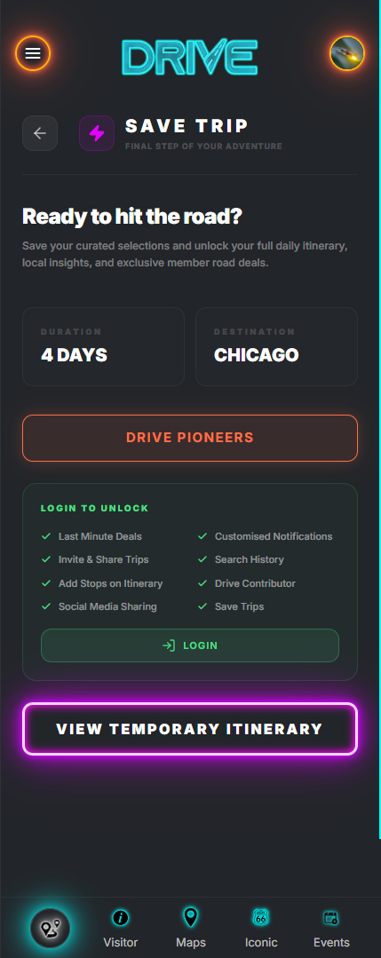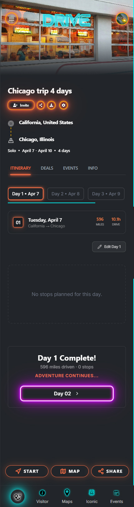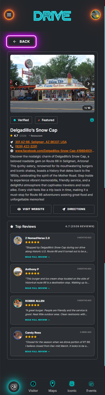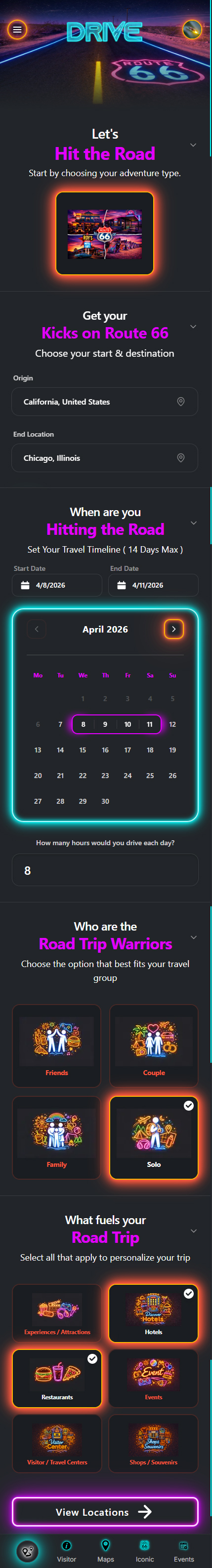 The ultimate Route 66 companion — offline maps, turn-by-turn navigation on the original alignment, real-time attraction info, restaurant discovery, and personalized trip planning.